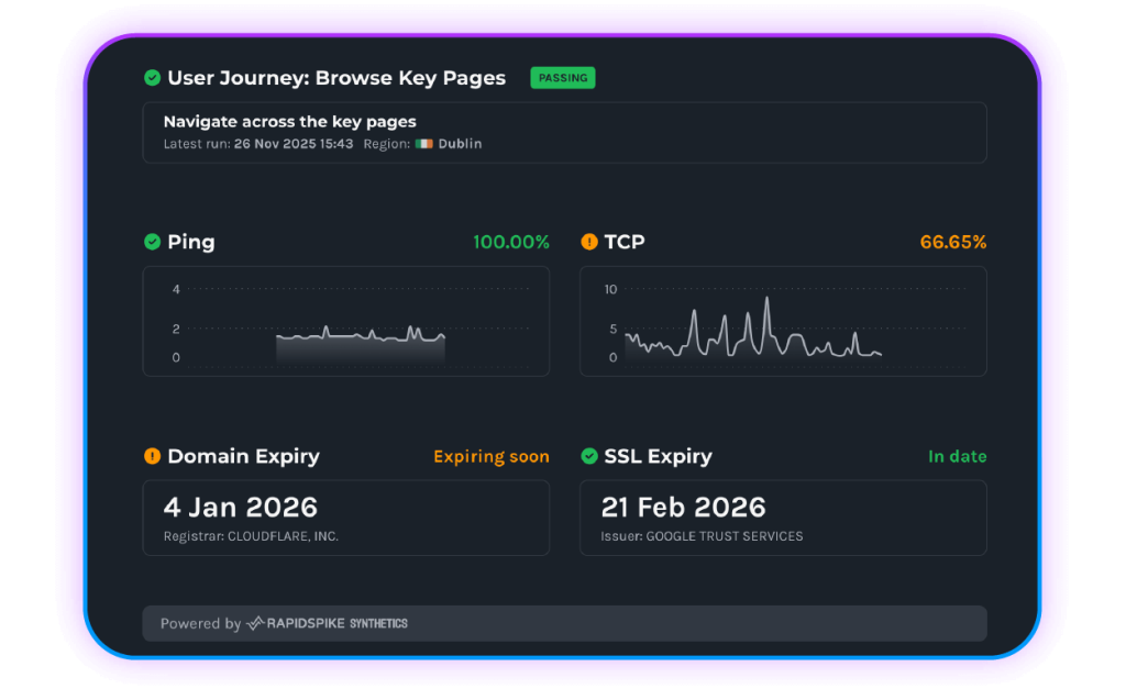 For those who want more detail, the new RapidSpike status pages surface deeper technical monitoring signals in a way that’s still easy to understand, including: