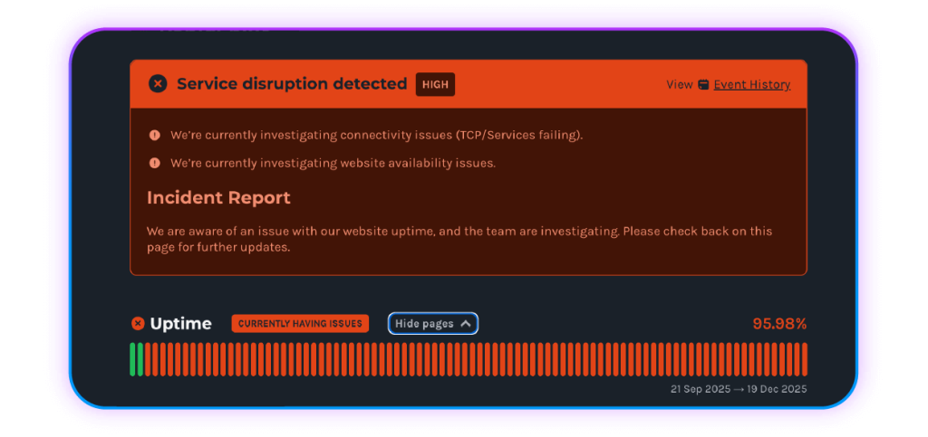 Clear communication is everything when it comes to service availability. Whether you’re managing a critical website, a SaaS platform, or customer-facing infrastructure, your users expect clarity, honesty, and real-time insight when things don’t go to plan.